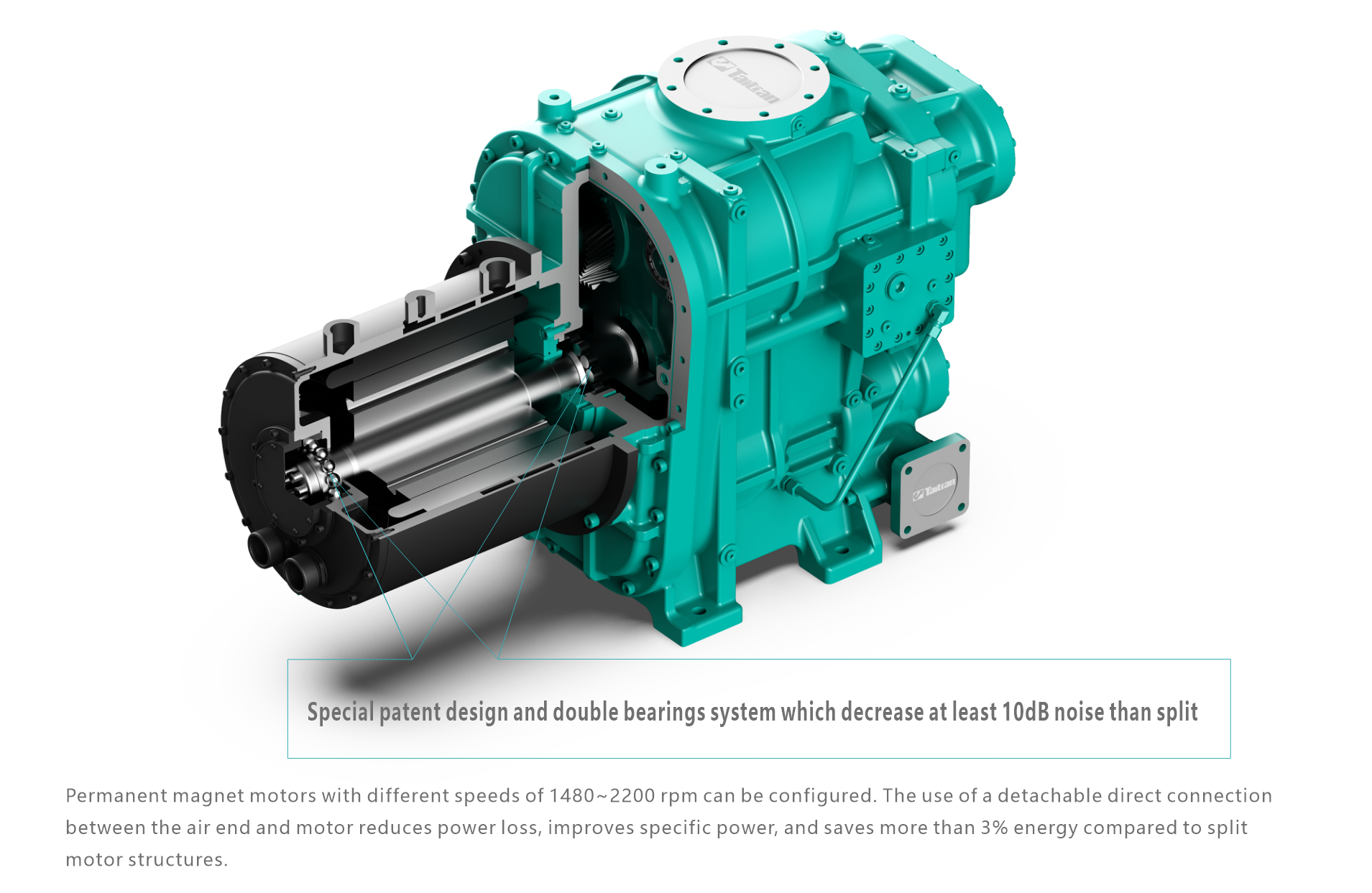 1.Motor adopts double bearings integrated structure, and the removable directconnection between the air end and the motor reduces power loss and improves energyefficiency of the air end.