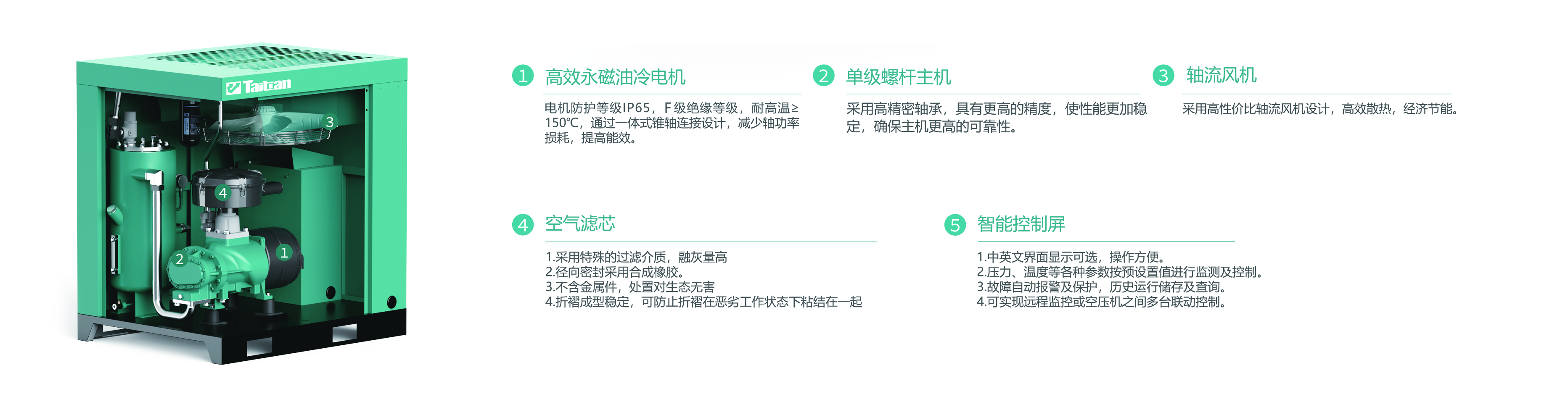 1、采用4顆高精密軸承設計,節能型壓縮機; 2、采用軸流風機,低轉速,低噪音; 3、采用油冷一體電機設計,減少軸功率損耗,提高能效; 4、采用獨特進風設計,提高節能效果,延長壽命; 5、可搭載PLC智慧控制系統,智能化控制運行。